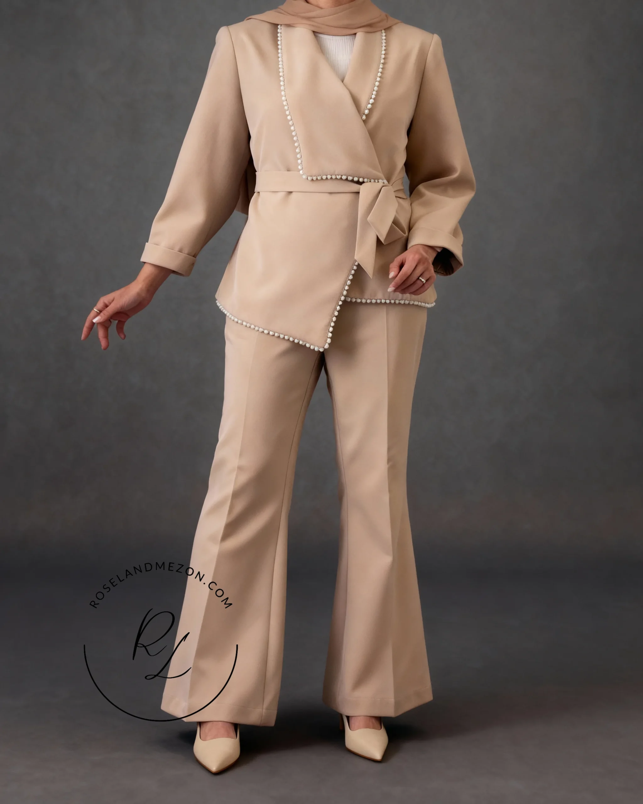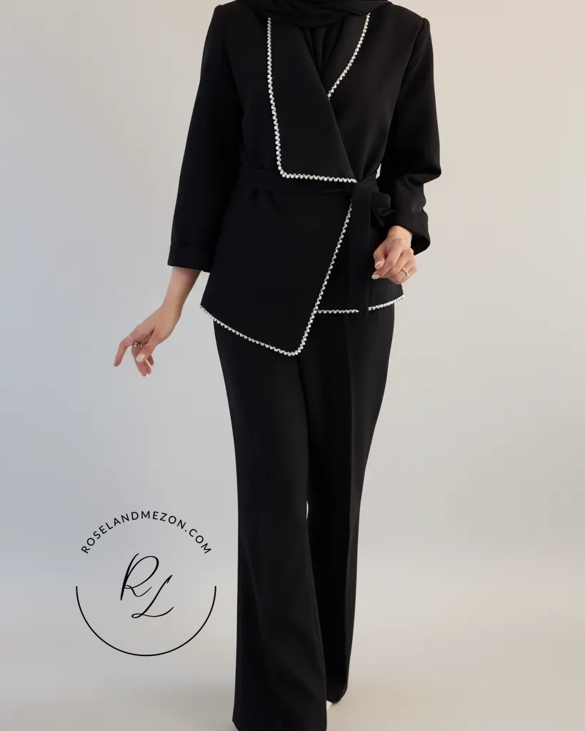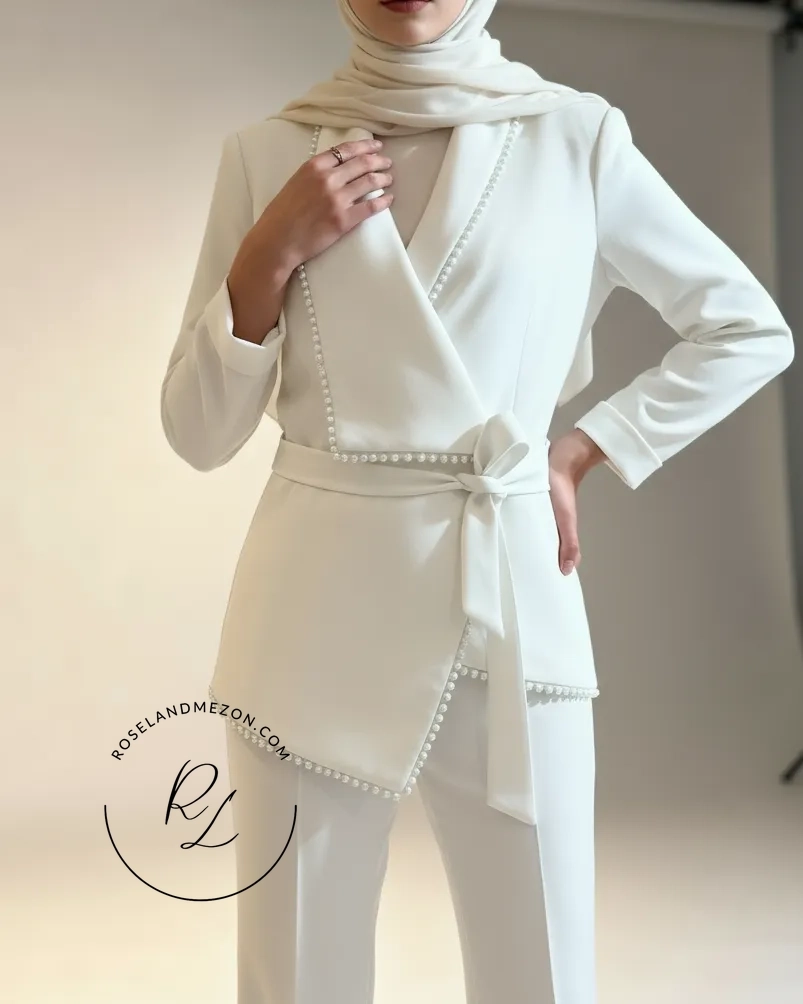 کت شلوار زنانه – کت یقه طرح‌دار مرواریددوزی‌شده